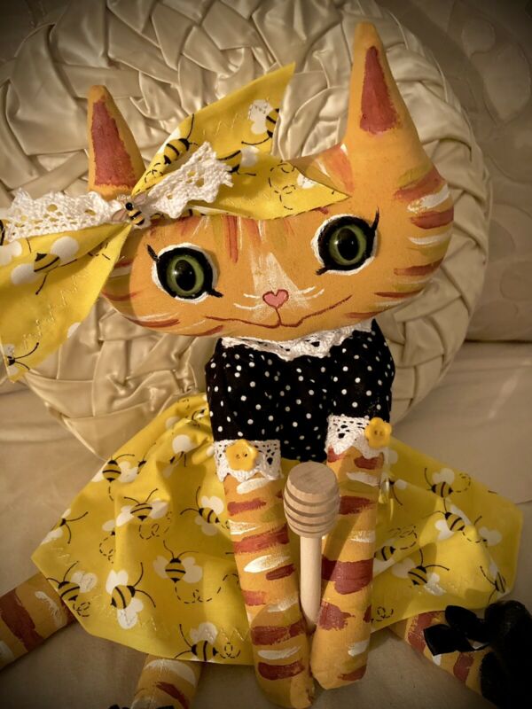 Title (ebay affiliate link): Primitive Doll Handmade Orange Tabby Cat Honey Bee Girl With Mini Honey Dipper