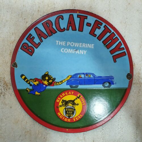 BEARCAT ETHYL 12 INCHES ROUND VINTAGE ENAMEL SIGN