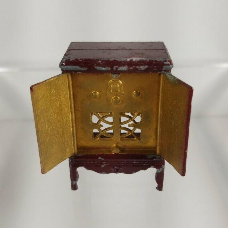 Title (ebay affiliate link): Vintage Tootsie Toys Metal Radio Cabinet Doll House Furniture Maroon Doors Open