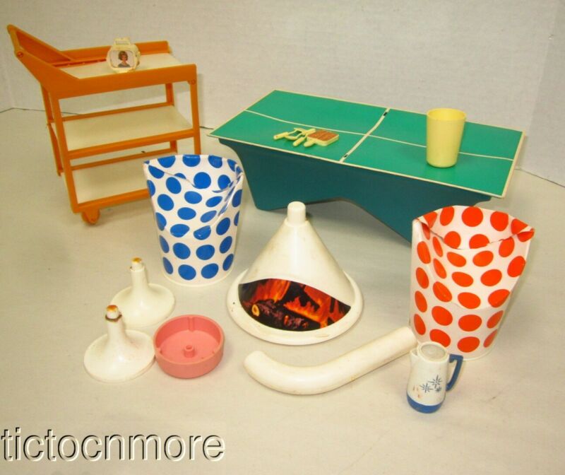 Title (ebay affiliate link): VINTAGE DOLLHOUSE MOD ERA FURNITURE LOT TAMMY BARBIE SIZE PING PONG CHAIRS FIRE