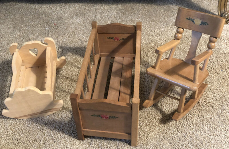 Title (ebay affiliate link): Lot Of 3 Vintage Wooden Doll Furniture Crib, Rocking Chair And Cradle Used