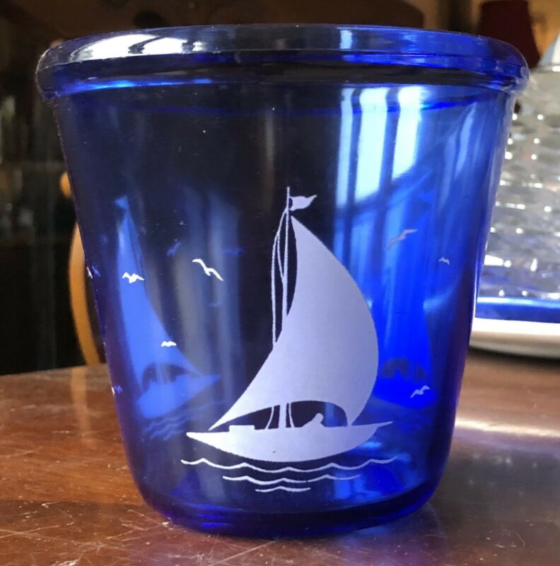 Title (ebay affiliate link): 1930s Vintage Hazel Atlas Cobalt Blue Glass Ice Bowl Bucket White Sailing Boat