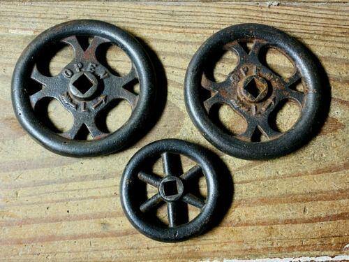 Title (ebay affiliate link): 3 Vintage Cast Iron Pressure Valve Handle Lot, Antique, Heavy Gauge, Steampunk