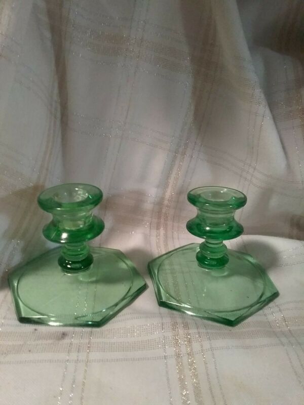 2 Vintage Green Depression Glass Candlestick Holders