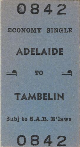 Railway tickets SAR Adelaide to Tambelin down adult economy single unused