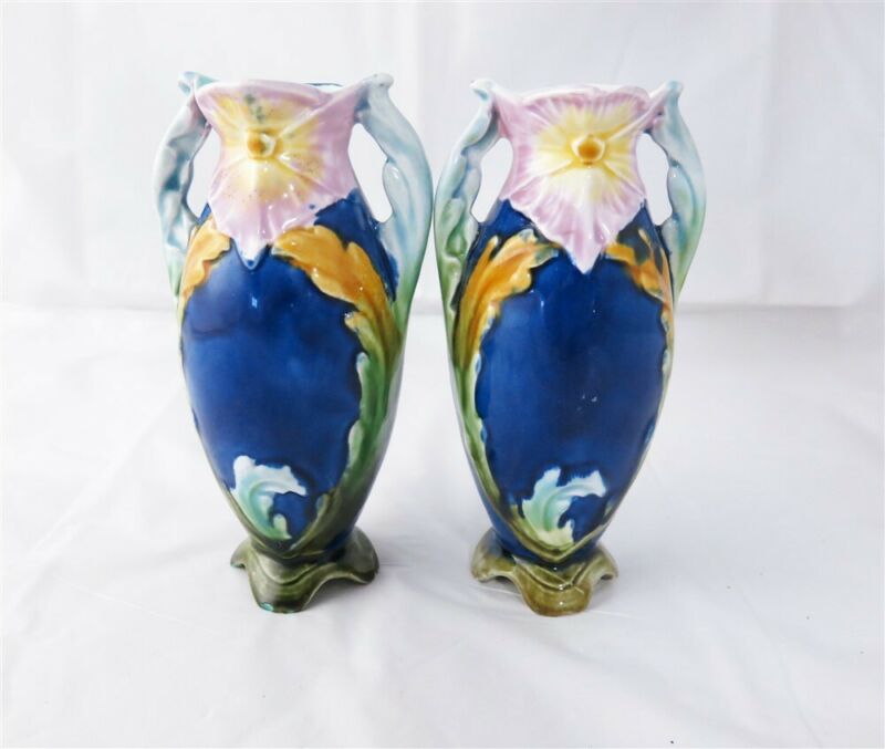 Title (ebay affiliate link): Pair Art Nouveau Majolica Porcelain Blue Floral Double Handle Vases ~5 5/8"