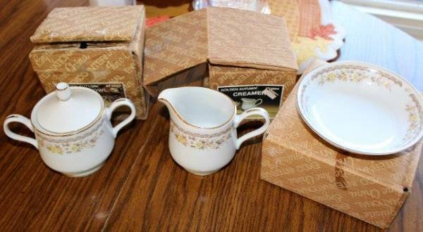Title (ebay affiliate link): Vintage NIP Golden Autumn Sugar Bowl Creamer 4 Cereal Bowls Ekco Made in Japan