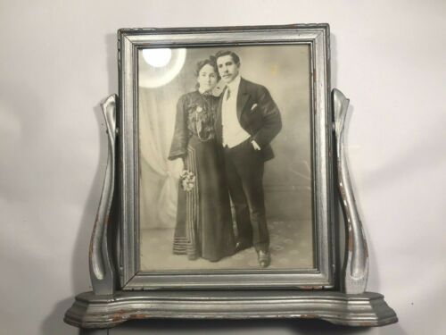 Vintage GLASS Antique Wood TILTING Picture Frame Couple