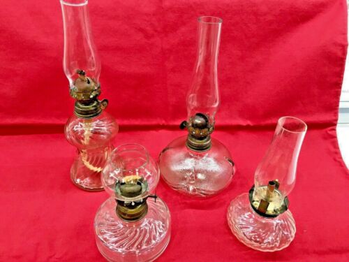 Title (ebay affiliate link): 4 Antique Clear Glass Miniature Oil Lamps, Lincoln Drape, All With Chimneys