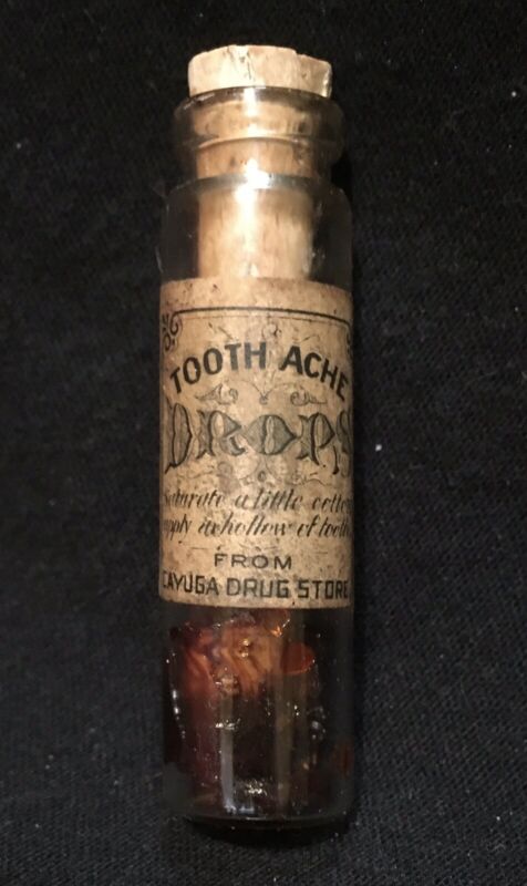 Title (ebay affiliate link): Antique Dental Tooth Ache Drops Bottle: Ornate Paper Label w/some Contents.