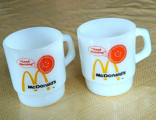 Title (ebay affiliate link): VTG Fire King Milk Glass McDonald''s GOOD MORNING Red Sun Set Of 2 Coffee Mugs