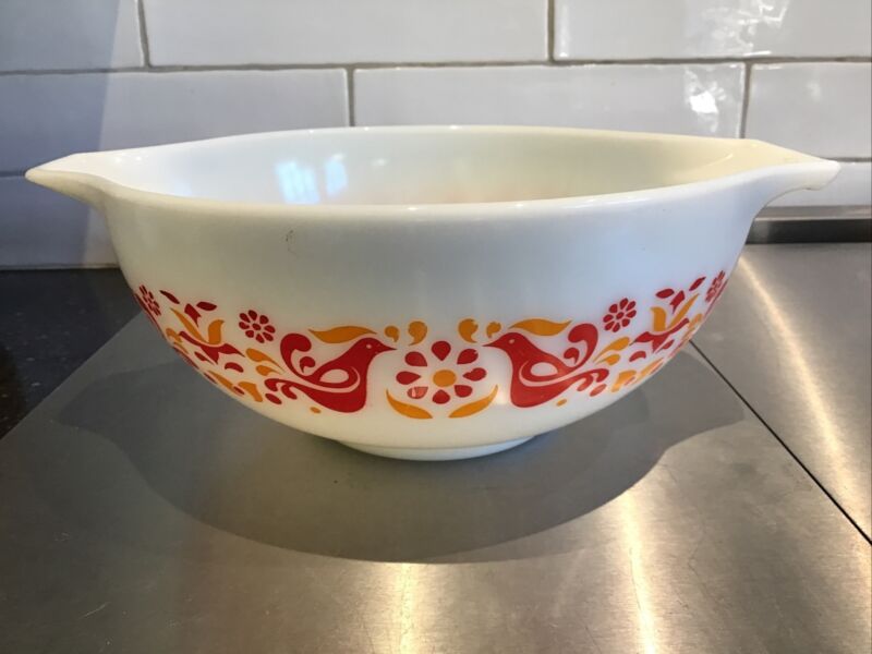 Title (ebay affiliate link): PYREX Friendship Red/Orange Birds on White 2 1/2 QT Cinderella Bowl #443