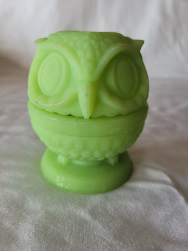 Title (ebay affiliate link): Fenton Green Satin Art Glass Owl Fairy Light #5108 Vintage