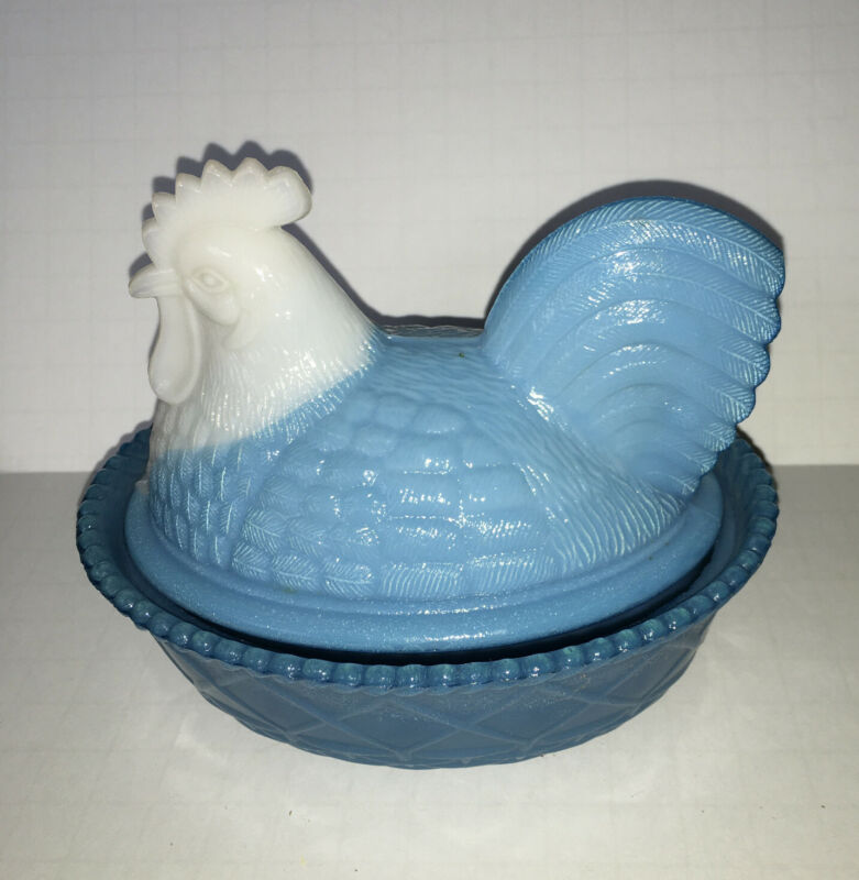 Title (ebay affiliate link): Vintage Westmoreland Blue & White Milk Glass Chicken/Hen In Nest Candy Dish Farm