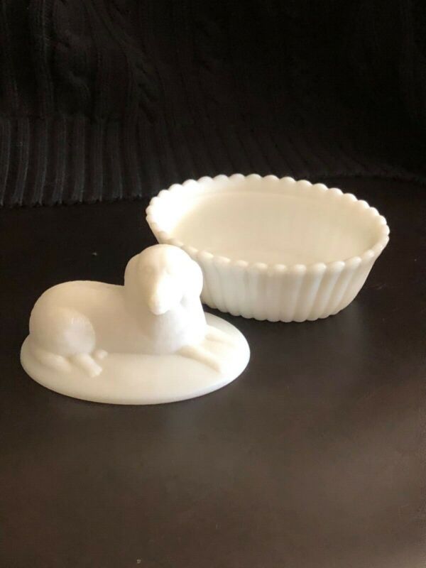 Vintage milk-white glass bowl w/dog on lid
