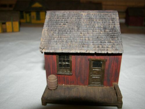 Title (ebay affiliate link): Vintage Toy Train Building Made of Wood 2 1/2" House w/Deck & Barrel