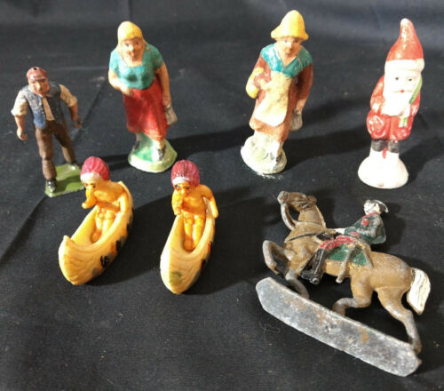 Vtg Painted Toy Lot Santa Claus Gnome, Indians In Canoes, Soldier On Horse, Etc