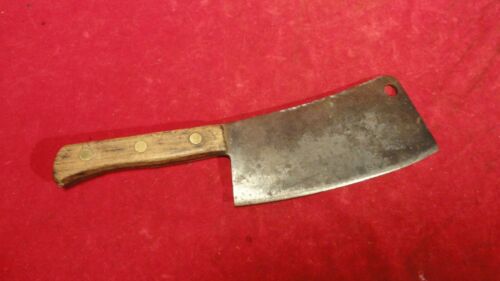GREAT 1800S ANTIQUE MEAT CLEAVER WITH WOODEN HANDLE -BRASS RIVETS -ENCERES -MARK