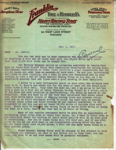 FRANKLIN TIRE & RUBBER CO. LETTERHEAD DATED MARCH 1, 1921. SOLD RACING TIRES