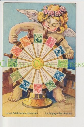 Old Postcard Artist Signed Minouvis Stamp Language Angel Steering Boat