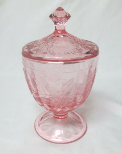 Title (ebay affiliate link): Vintage Pink Depression Glass Pedestal Sugar Bowl w/Lid-Poinsettia-EXC!-L@@K!
