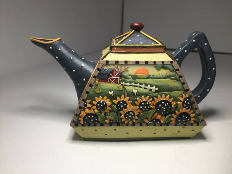 Title (ebay affiliate link): Resin Teapot Farm Scene Sunflowers Bees Sunrise *Does Not Open*