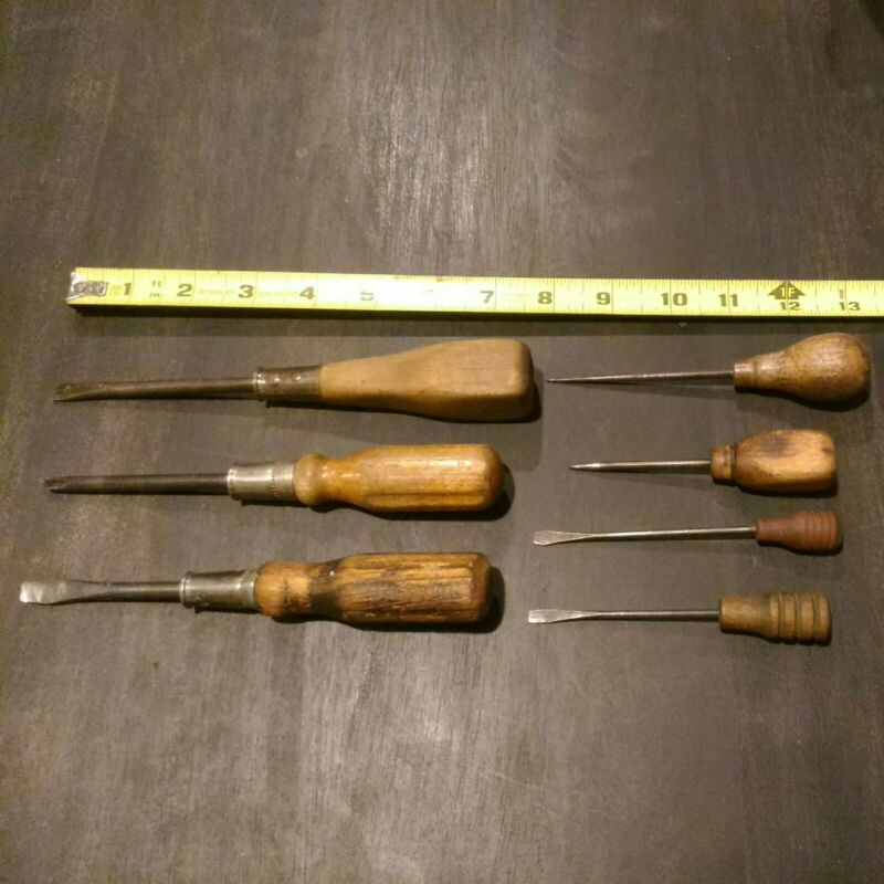 Title (ebay affiliate link): OLD VINTAGE WOODEN HANDLE SCREWDRIVERS & PICKS/AWLS