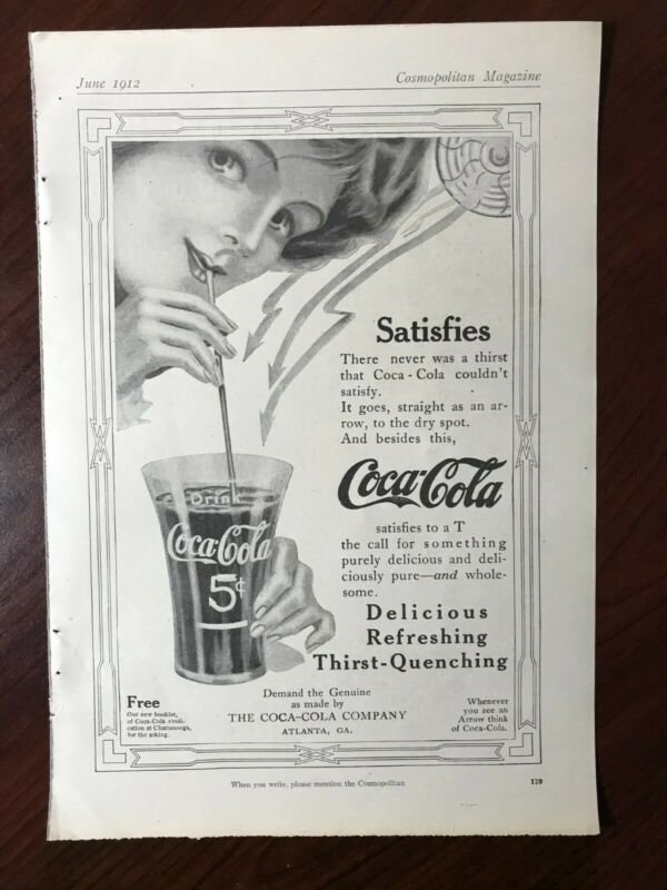 Title (ebay affiliate link): 1912 Coca-Cola Satisfies B & W Print Ad - Cosmopolitan Magazine June 1912