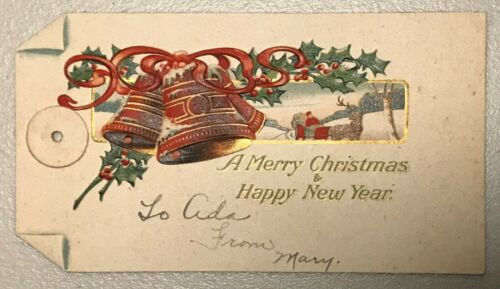 Title (ebay affiliate link): Antique Dennison? Large Gift Tag Present Christmas Santa Reindeer Bells