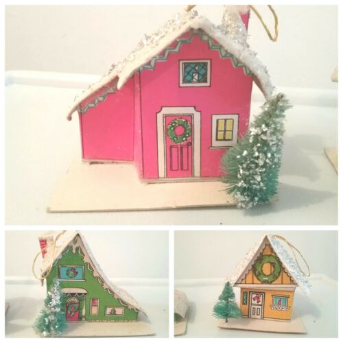 Title (ebay affiliate link): Vtg. lot of 3 Mica Putz Cardboard Christmas Houses made in Taiwan.