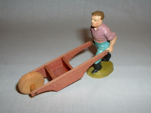 Vintage German Composition Christmas Putz Figure Pushing Wheel Barrow