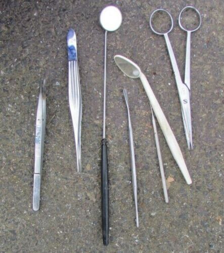 Title (ebay affiliate link): Vintage Dental Medical Tools Mirrors Tweezers Scraper Scissors etc