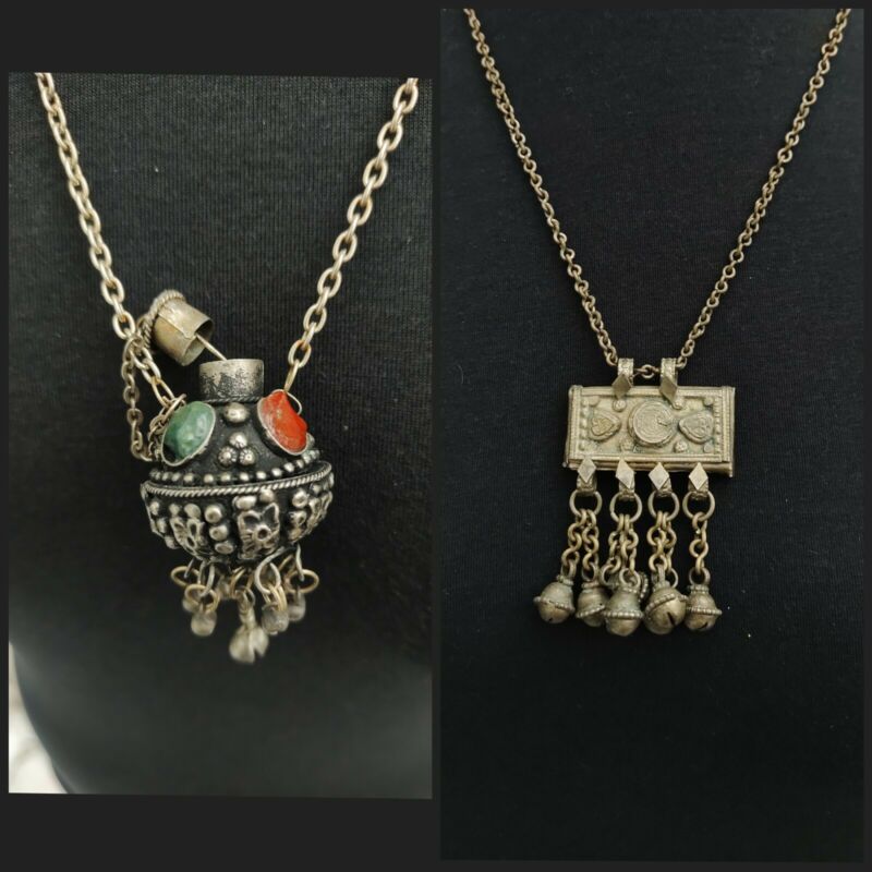 2 Vintage silver metal opening pot jade Jasper stone antique long chain 1 plain
