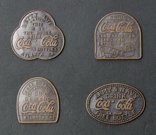Title (ebay affiliate link): Set of 4 Coca Cola Free Bottle of Coke Vintage Copper Tokens