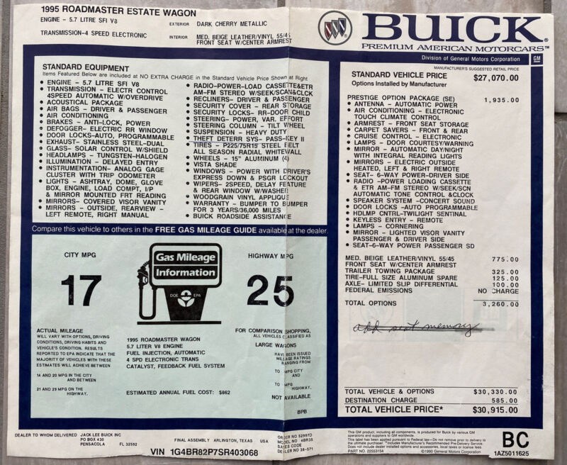 Title (ebay affiliate link): ORIGINAL1995 BUICK Roadmaster Estate Wagon Window Price Sticker and Options