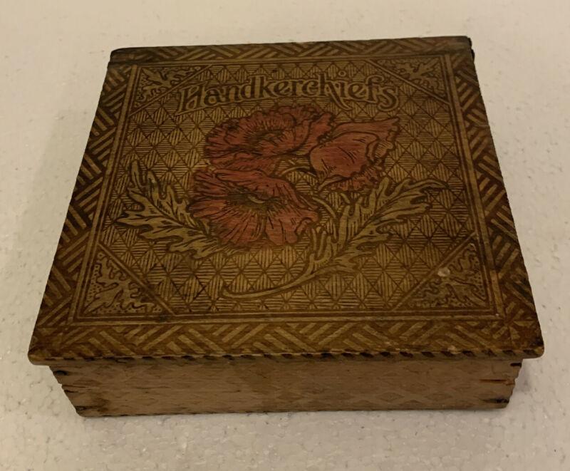 Title (ebay affiliate link): Antique Pyrography wooden handkerchief-trinket box with Flower design Dated 1920