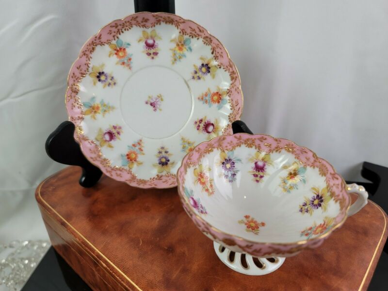 Antique Hand Painted Porcelain Footed Cup And Saucer Mint