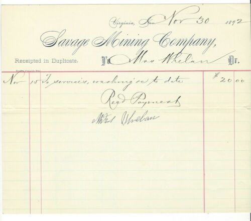 Title (ebay affiliate link): 1892 Receipt Savage Mining Company, Virginia City, Nevada to Mrs. Whelan & etc.+