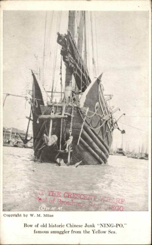 Title (ebay affiliate link): Chinese Junk Ship Ning-PO Crescent Wharf San Diego CA Stamp Postcard c1915