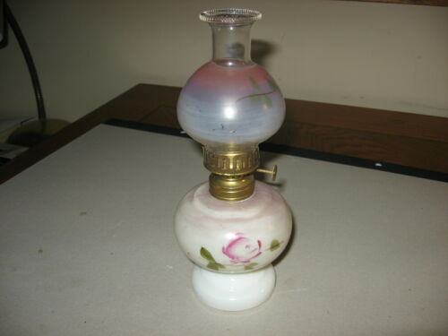 Title (ebay affiliate link): Antique Circa 1910 Miniature Oil Lamp Milk Glass With Shaded Artwork