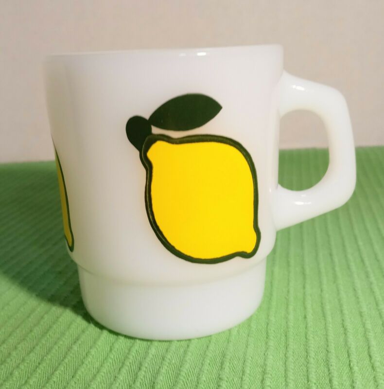 Title (ebay affiliate link): VINTAGE FIRE KING ANCHOR HOCKING LEMON FRUIT MUG/CUP Stacking USA