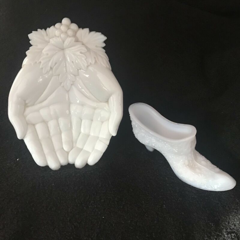 Title (ebay affiliate link): VINTAGE LOT 2 PIECES MILK GLASS HANDS AND SHOE ONE TRANSLUCENT GLASS