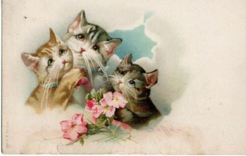 VINTAGE ART postcard: PRETTY CATS WITH FLOWERS