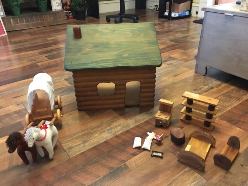 Title (ebay affiliate link): Wooden Cabin With Furniture, Grimms Horse & Buggy