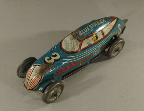 ORIGINAL VINTAGE BLUESTREAK WIND-UP METAL TIN RACING CAR 4" LONG