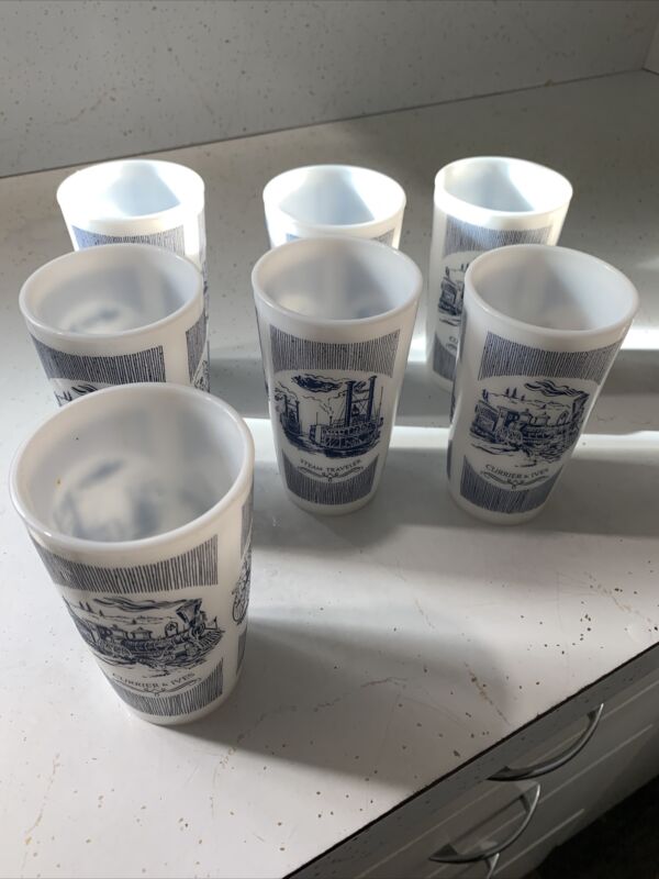 Lot Of 7 Vintage Currier And Ives Rare Milk Glasses Summertime Steam Traveler