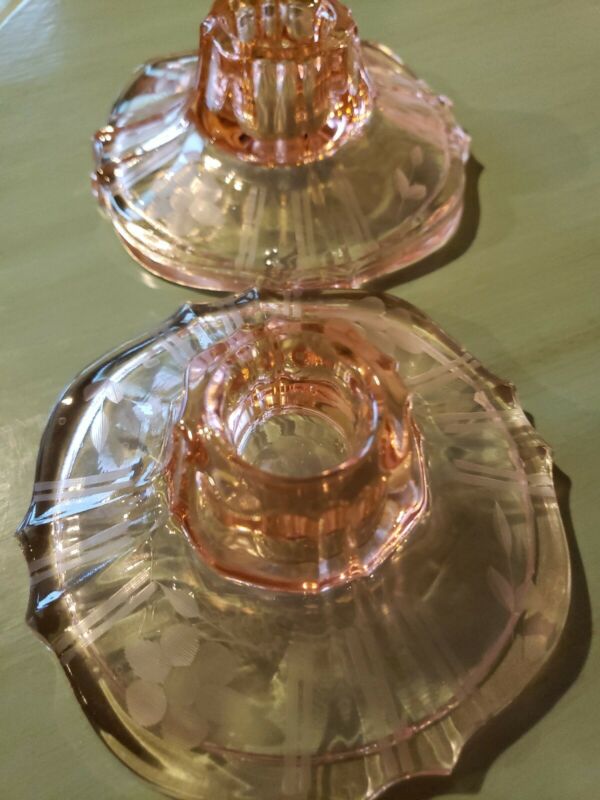 Title (ebay affiliate link): Vintage Pink Depression Glass Candle Holders With Etched Glass
