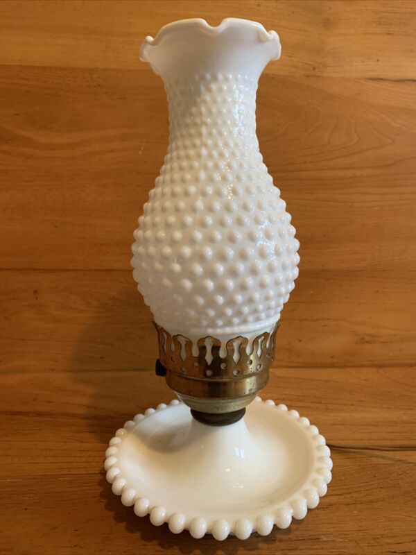 Title (ebay affiliate link): Vintage White Milk Glass Hobnail Hurricane Lamp Mid Century Gold