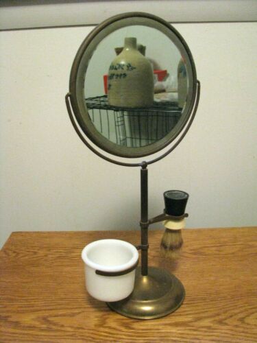 ANTIQUE SHAVING MUG with MIRROR on BRASS STAND / Acme Milk Glass Mug