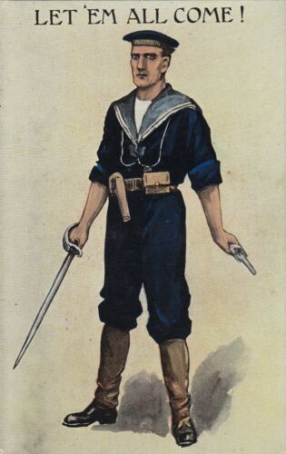Title (ebay affiliate link): Let''em All Come! Royal Navy Sailor Patriotic WW1 Valentine Postcard